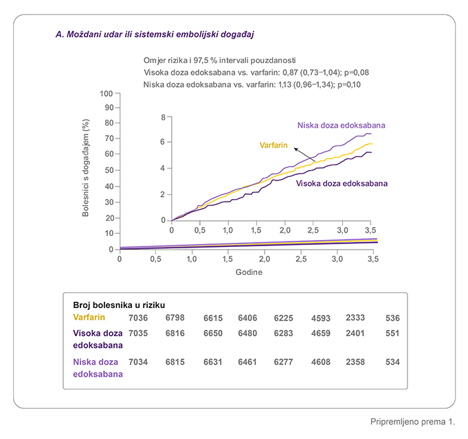 Edoksaban nije bio inferioran u odnosu na varfarin za prevenciju moždanog udara ili sistemske embolije kod odraslih pacijenata s fibrilacijom atrija te je bio povezan sa značajno nižom stopom krvarenja i smrtnosti uzrokovane kardiovaskularnim uzrocima.1
