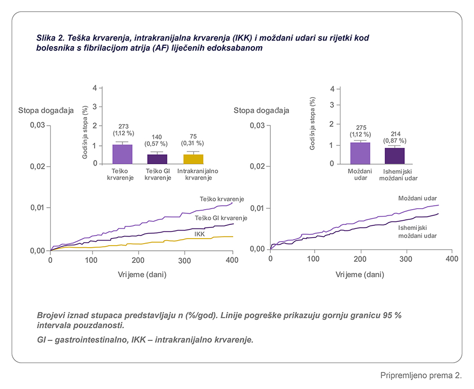 Moždani udar, intrakranijalna krvarenja i druga velika krvarenja bili su rijetki kod pacijenata s AF koji su se liječili edoksabanom u rutinskoj kliničkoj praksi.2